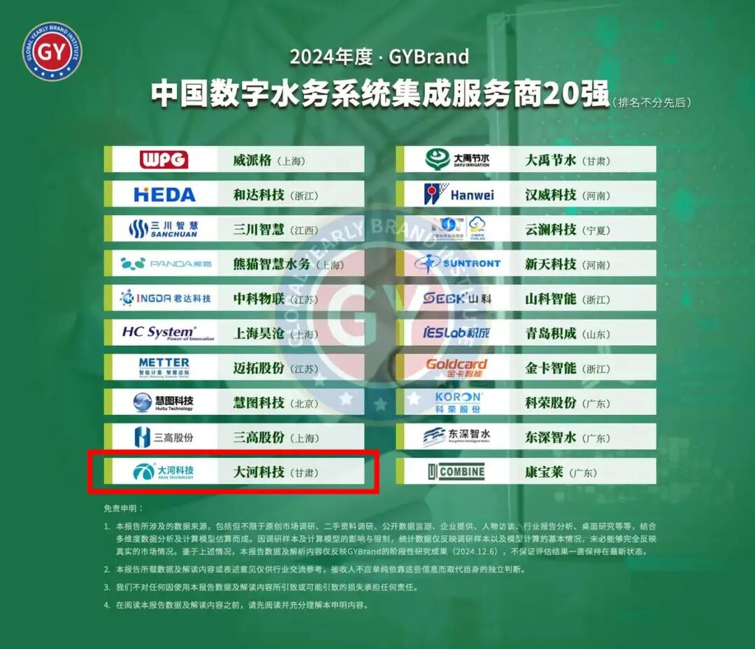 GYBrand+全球品牌研究院发布了2024年度“中国数字水务系统集成服务商20强排行榜”(排名不分先后)。甘肃大河科技有限公司荣幸登榜!